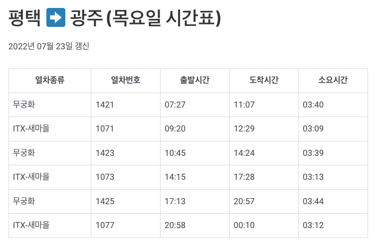 | 구례구역 열차시간표, 기차시간표, ktx 시간표 (0) | 2022.08.12 |