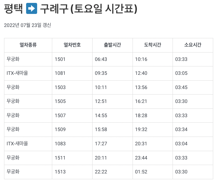 구례구역 열차시간표, 기차시간표, ktx 시간표 (0) | 2022.08.12 |