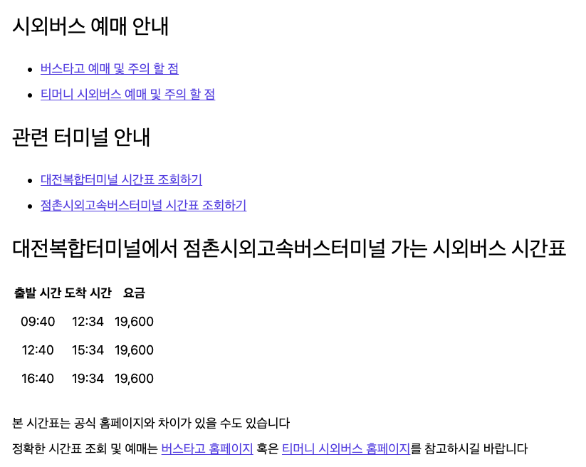 대전 복합터미널 시외버스시간표 조회하기